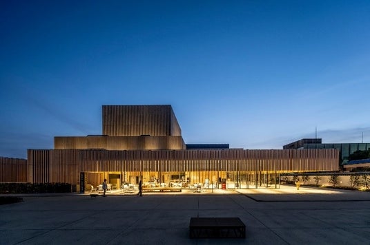 同劇場は、かつて大阪三大城下町として栄えた高槻城の二の丸跡地に、高槻市の新たな文化芸術の拠点として令和5年3月18日に開館。緑豊かな高槻城公園内にあり、気軽に立ち寄ってもらえるよう、エントランスは公園の散策路と一体となっていて、高槻城をモチーフとした堀や塀を設置し、建物の外壁に城下町の格子戸をイメージした木材を張り巡らせるなど、歴史的な遺構を現代風にアレンジしています。館内は、手すりやフロアマップにも木材を使用するなど木材を多用し、ガラスの壁を多く採ることで、温もりのある明るく開放的な空間になるよう設計され、さらに、北大阪最大級の1500 席を備えた大ホールは、高機能な舞台装置に加え、音響効果を高めるように壁面から天井までホール全体に地元産の木製キューブで覆われた特徴的なデザインになっています。今回、公園と一体化したデザインやほとんどの空間がガラス張りになっていて透明感にあふれていること、劇場内で公演がない平常時にも施設内を通り抜けができ、近くの住民や子どもたちが立ち寄ることができるといった「広く開かれた公共建築」である点、2万7千個の木キューブで個性的かつ豊かな音空間を実現した大ホールをはじめ徹底的に木材の活用を試みている点などが高く評価され、同賞の受賞に至りました。