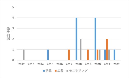 スタートアップ企業はあたらしい技術で社会に影響をあたえる企業であり、特許と同様、近未来における社会実装の指標といえます。狭義、広義、およびモニタリングの3領域における2012年以降のスタートアップ企業設立数の年次推移を図3にしめします。