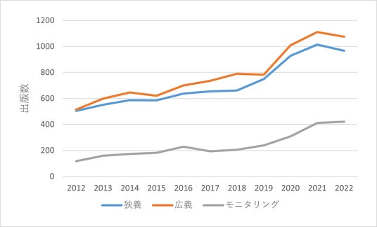 モニタリング領域では2022年の出版数が2015年出版数の約2.3倍と、広義と狭義領域の約1.7倍に比較して高い増加率となっています。絶対数では広義と狭義領域が多く、今後の技術革新の中心となると考えられますが、モニタリング領域にも注目はあつまっていることがみてとれます。
