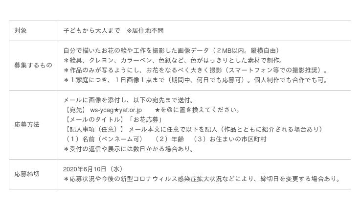 横浜市民ギャラリーでは現在、お花の絵や工作を撮影した写真を募集している。「お休み中の展示室に花を咲かせよう!ー描いて、撮って、参加しよう-」と題し、集まった写真は臨時休館中の展示室に飾られ、その様子を同館のSNSで見ることができる。子どもから大人まで誰でも参加が可能で、写真はメールに添付して同館へ送付する。