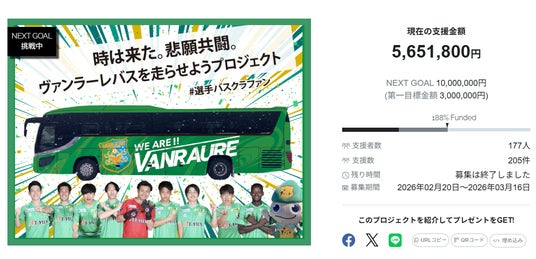 チーム・団体やアスリートを支援するスポーツ専門クラウドファンディングを展開するスポチュニティ株式会社(東京都中央区、以下スポチュニティ)は、ヴァンラーレ八戸のトップチームバスのラッピングを目的としたクラウドファンディングプロジェクトを2月20日から開始し、目標である300万円に対して188%にあたる565万円の支援を集めて、終了しました。