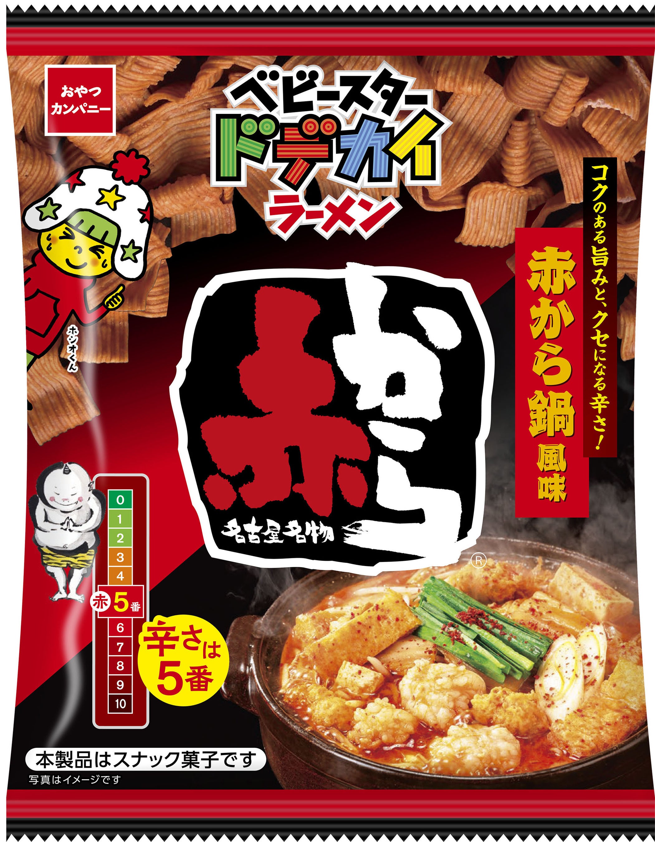 愛知県名古屋市に本店を構える名古屋発祥の人気チェーン店『赤から』。味噌・唐辛子・スパイス等を10種類以上ブレンドした秘伝のスープと、11段階から好みの辛さを選べる「赤から鍋」は、辛さの中にも旨みとコクがあり、ひとくち食べたらやみつきになる味わいが人気の看板メニュー。そんな旨辛い味わいが絶品な「赤から鍋」とベビースターが、好評につき通算7回目のコラボ!今回は前回の“赤3番”から、『赤から』通が選ぶ刺激的な辛さの“赤5番”に。ガツンとくる辛さだけでない奥深いコクのある旨みがクセになる味わいに仕上げました。