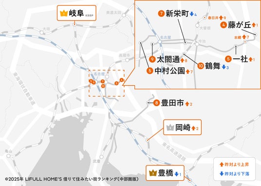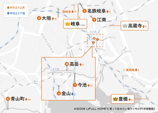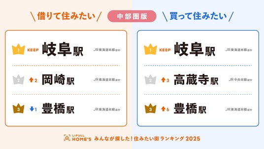賃貸物件への問合せ数を集計した「2025年LIFULL HOME'Sみんなが探した!借りて住みたい街ランキング(中部圏版)」は、圧倒的な強さでJR東海道本線「岐阜」が7年連続の1位となりました。2位「岡崎」、3位「豊橋」の約1.5倍の問合せ数を獲得し、名古屋市の“衛星都市”3強が上位を独占しています。