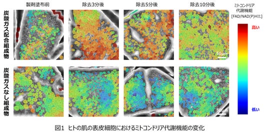 炭酸ガス配合組成物の塗布により表皮細胞のミトコンドリア代謝機能が高まることを、ヒトの肌で確認