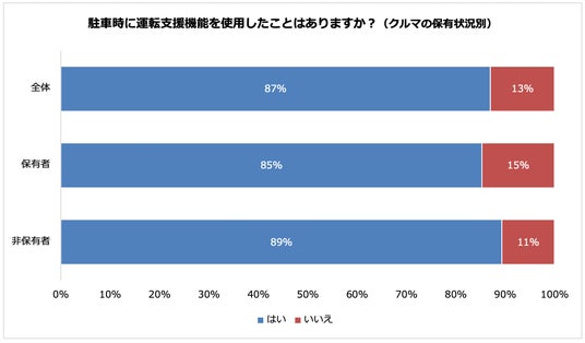 苦手と感じている人が多い「駐車」時に、運転支援機能を使ったことが「ある」と回答した人は87%でした。クルマの保有者よりも非保有者の比率がわずかながら高い理由としては、レンタカー・カーシェアリング事業者の貸出車両への運転支援機能の標準装備化が進み、利用するクルマに搭載されているケースが多いことが影響しているものと思われます。