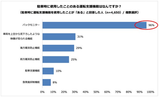 駐車時に使用したことがある運転支援機能は「バックモニター」96%がトップで、2位の「車両を上空から見下ろしたような映像が見られる機能」31%と65ポイント差となっています。以降、「後方衝突防止機能」29%、「前方衝突防止機能」25%と続きました。