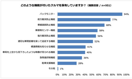 運転支援機能付きのクルマ保有者が搭載している機能は、「バックモニター」94%が最多でした。2位は、「前方衝突防止機能」77%、3位は「車線逸脱防止機能」68%となっています。