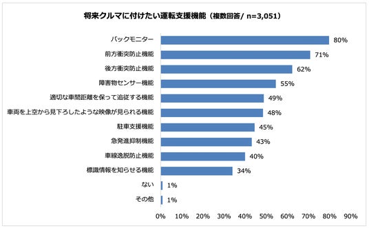 運転支援機能付きのクルマを「購入したい」と回答した人が搭載したい運転支援機能の1位は「バックモニター」80%でした。次いで、「前方衝突防止機能」71%、「後方衝突防止機能」62%となっています。