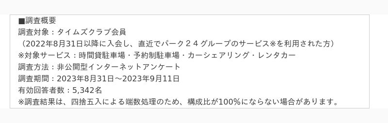 ※入会金・年会費無料の会員制ポイントプログラム。タイムズパーキングやタイムズカー、タイムズカーレンタルの利用等でポイントがたまる他、会員限定サービス等を提供。会員数約1,091万人(2023年11月末現在)。なお、本アンケートは、駐車場やカーシェア、レンタカー等のクルマに関わるサービスを利用した方々を対象としたものです。