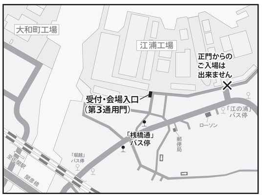 2.工場及び工場周辺には駐車場がありませんので、ご来所の際は公共交通機関を利用ください。