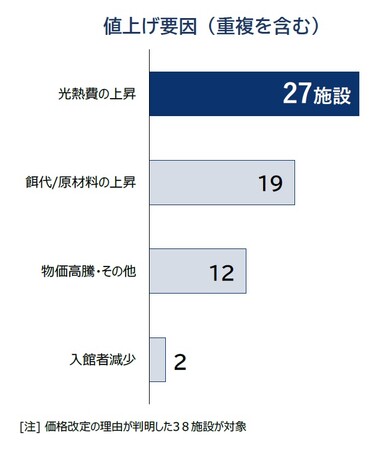 背景には、エネルギーや機械部品価格といった施設管理コストの上昇に加え、動物園や水族館では高騰する餌代に対応するため価格を引き上げたケースが多くみられた。価格改定の理由が判明した38施設のうち、最も多かった要因は「光熱費の上昇」で27施設に上り、値上げ理由の7割を占めた。特に大規模な水族館、ジェットコースターなど遊具の稼働が多い遊園地などでは電気代の上昇で光熱費が前年から最大で1.5~3倍近くに上る施設もあるなど運営への影響が大きく、値上げに踏み切らざるを得なかった施設が多くみられた。次いで多いのが「餌代・原材料の高騰」(19施設)、「物価高騰・その他」(12施設)だった。水族館では餌となる魚代、動物園では燃油代に加えて輸入肉類、乾草や固形飼料のペレット類など動物の餌代上昇などが価格改定の理由にあげられた。