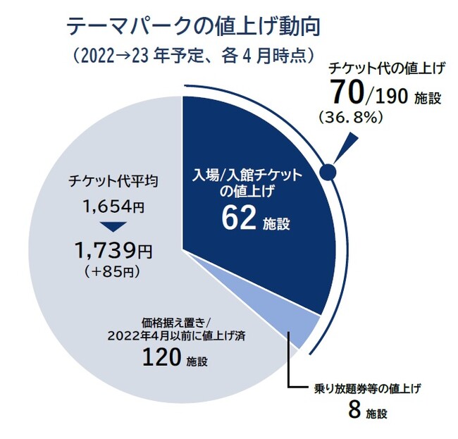 人件費や電気代、各種物価の高騰を受け、テーマパークで値上げが相次いでいる。全国の主要な遊園地や水族館、動物園など計190のテーマパークにおける、2022-23年4月時点の入場(入館)チケットの販売価格を調査した結果、約4割の70施設で値上げが判明した。このうち、入場チケットの値上げが62施設、入場料を据え置いたものの、別途購入が必要な乗り放題パスなどを値上げした施設が8施設だった。チケットの値上げは見送ったものの、駐車場代や場内でのフード・ドリンクサービスを値上げした施設も複数見られた。