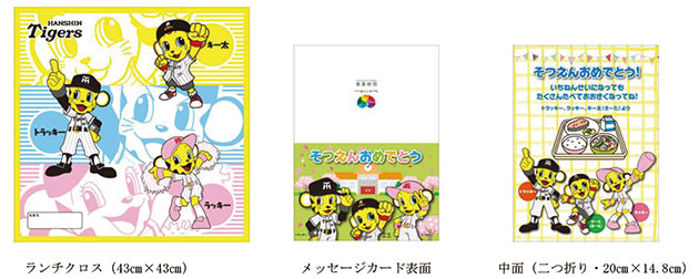 阪神電気鉄道株式会社(本社:大阪市福島区、社長:藤原崇起)では、沿線の幼稚園及び保育所を卒園する子どもたちに、卒園記念として、当社グループを代表する阪神タイガースのマスコットである「トラッキー」、「ラッキー」、「キー太」を描いたランチクロス(メッセージカード付き)をプレゼントします。
