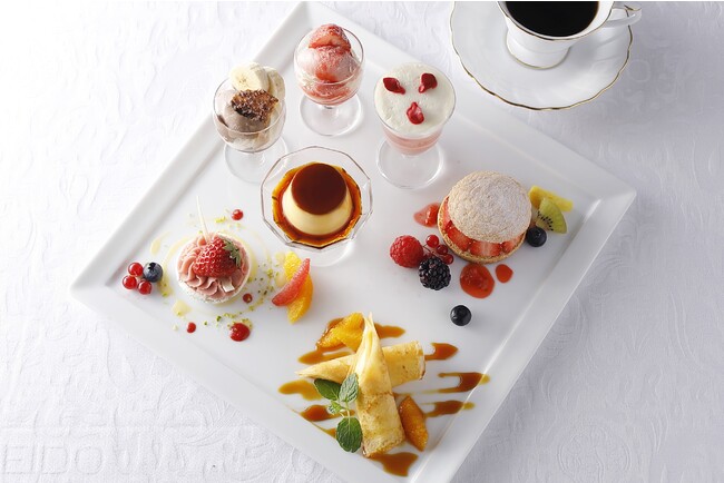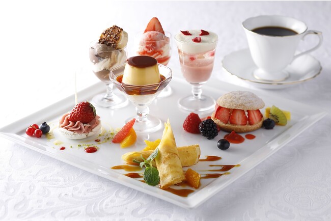 オレンジのクリーム入りクレープとキャラメルソース、可愛らしい苺入りチーズクリームのブッセ、ライチのジュレに赤桃のクリームとバラの花びらを乗せたグラスデザート、ルビーチョコレートと苺をトッピングしたマカロンなど資生堂パーラー定番のパフェやプリンもプティサイズでお楽しみいただけるワンプレートのデザートです。