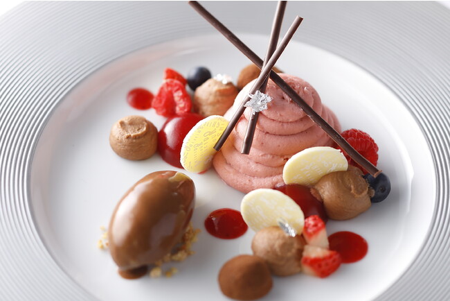 ベルギー産のルビーチョコレートはムースに、フランス産のチョコレートをクリームに、イタリア産のチョコレートはトリュフに仕立て、様々な国のチョコレートを違ったスタイルで味わえる一皿です。苺のクッキーやラズベリーのジュレ、数種類のフルーツも合わせてお楽しみください。