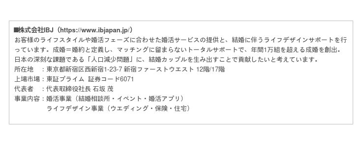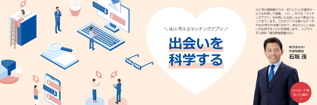 結婚相談所事業を中心に、日本一*1の成婚数を誇る株式会社IBJ(代表取締役社長:石坂茂、本社:東京都新宿区、東証プライム:6071)は、コーポレートサイト内に「IBJマッチングアプリ研究室」をリリースしました。最新の出会いに関するデータや成婚ノウハウをもとに、テーマ別に記事を発信。マッチングアプリをこれから使いたい、今現在使っていて悩んでいる方等に、ぜひご覧いただきたい情報をお届けします。