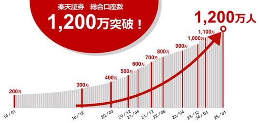 楽天証券株式会社(本社:東京都港区、代表取締役社長:楠 雄治、以下「楽天証券」)は、2025年1月に、証券総合口座数が国内証券会社単体(開示情報ベース)で最多(※1)の1,200万口座超となったことをお知らせします。また、1,200万口座達成を記念して、2025年1月14日(火)より、楽天証券公式Xアカウントをフォローし、「#楽天証券」とメッセージを添えて引用リポストいただいたお客様から、抽選で30名様に12,000ポイントを進呈する、「楽天証券1,200万口座突破!キャンペーン」を実施する予定ですので、あわせてお知らせします。