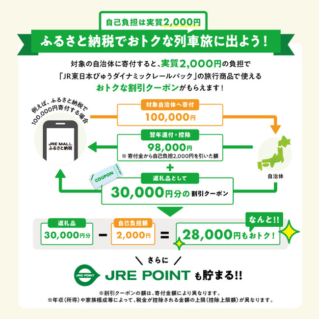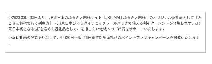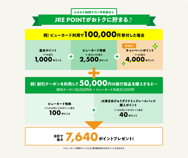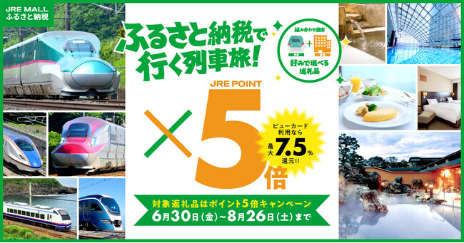 期間中、『ふるさと納税で行く列車旅』~JR東日本びゅうダイナミックレールパックで使える割引クーポン~の返礼品はJRE POINT5%還元、ビューカード利用なら最大7.5%還元