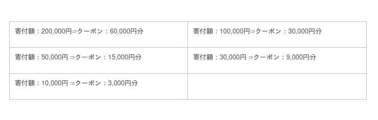 例)寄付額100,000円の場合30,000円分の割引クーポンが返礼品としてもらえます。
