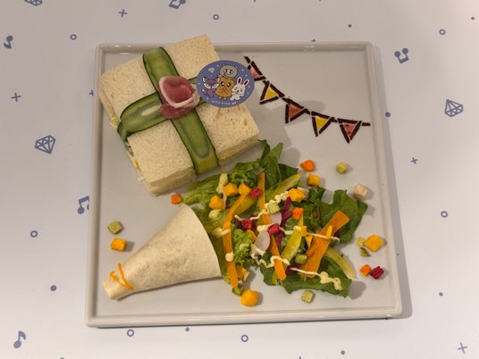 カフェのメニューの一番のおすすめは「Happy Box Plate」です。たまごとバジルツナマヨのサンドイッチプレートで、上から見るとパーティーのクラッカーを鳴らした時のようなデザインになっており、眺めるだけでも楽しい気持ちになります。