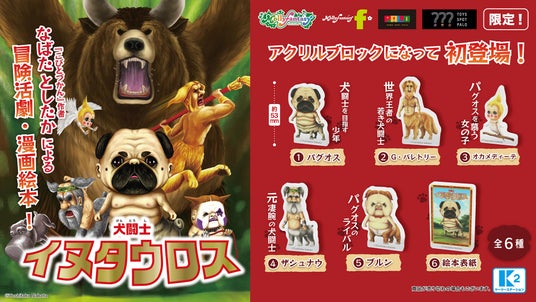 両親との再会を夢見て”犬闘士”を目指す、天涯孤独の少年「パグオス」の成長を描いた大河物語『犬闘士 イヌタウロス』のカプセルトイが初登場。「パグオス」、「バレトリー」、「オカメディーテ」、「ザシュナウ」、「ブルン」、「絵本表紙」のアクリルブロック全6種類を展開いたします。