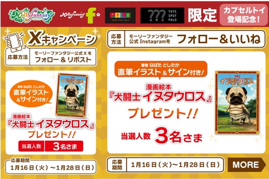 限定カプセルトイ用景品の展開を記念し、モーリーファンタジー公式X(旧:Twitter)・Instagramで直筆イラスト&サイン付きの漫画絵本「犬闘士 イヌタウロス」が当たるプレゼントキャンペーンを開催いたします。