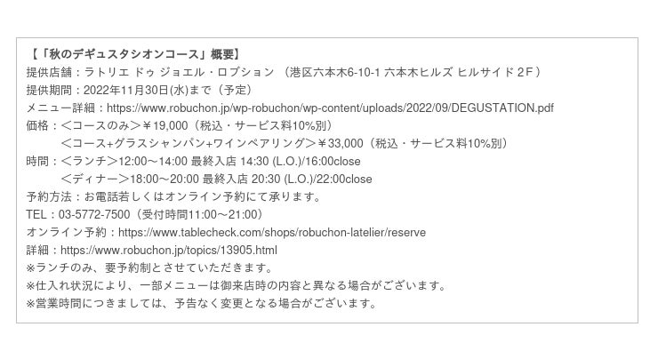 株式会社フォーシーズ(東京都港区南青山 代表取締役社長:淺野幸子)が運営する「ラトリエ ドゥ ジョエル・ロブション」(六本木ヒルズ内)では、2022年11月30日(水)までの期間限定で『秋のデギュスタシオンコース』を提供いたします。 『秋のデギュスタシオンコース』とは秋の食材をふんだんに使用したシェフお任せのコースです。