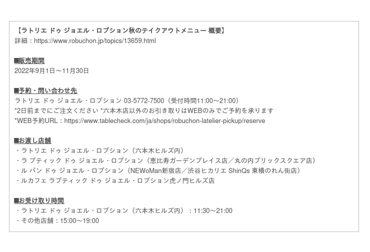 【数量限定販売】ラトリエ ドゥ ジョエル・ロブション 秋のテイクアウトメニュー