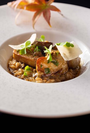・フランス産 鴨のフォアグラのプランシャ焼き セップ茸のリゾットと共に