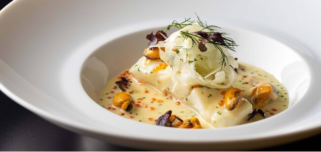 ・平目のポシェとモン・サン・ミッシェル産ムール貝 フヌイユの香るソースで