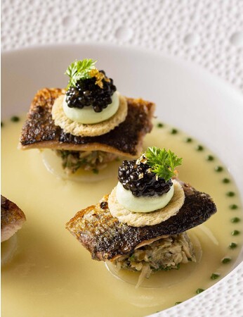 詳細:素材を生かした味わいと芸術的な装いが両立するジョエル・ロブションを象徴する代表的な一皿。カリフラワーの柔らかなクリームとオマール海老のジュレの溶け合うハーモニーをご堪能ください。