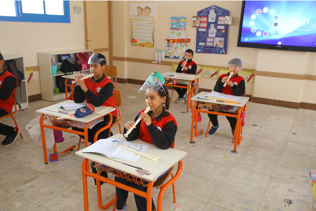 エジプトの公立学校「エジプト・日本学校(EJS)」全48校を対象に、日本型音楽教育全般(歌唱・器楽・音楽づくり・観賞)を網羅した音楽科の教材を、音楽のカリキュラムがない小学3年生向けに新たに作成し、併せて教員養成支援を行います。また、音楽のカリキュラムはあるが器楽学習の機会がない小学4年生には、リコーダーを使用した器楽教育を導入します。さらに産官学の連携として、在日エジプト大使館やエジプト教育・技術教育省と本事業の運営を推進し、特定非営利活動法人東京学芸大こども未来研究所とともに、音楽科教材の制作や、非認知能力を含む全人的な教育に関する調査研究を行います。