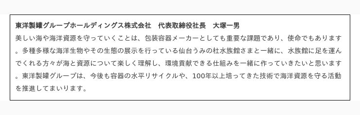 海と人、水と人との、新しい「つながり」をうみだす水族館『仙台うみの杜水族館』では、循環型社会を目指したリサイクル推進活動「うみのもリサイクル」を2024年4月1日(月)より開始いたします。包装容器の業界を牽引してきた『東洋製罐グループホールディングス株式会社』さまにご協力いただき、これまで“ごみ”として処分していたフードコートの使用済みコップを、リサイクル可能な“資源”として活用していくことを目指します。