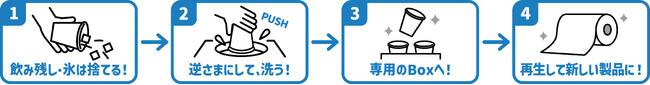 ドリンク提供用コップをプラスチック製から紙製に変更するほか、使用済みの紙コップを簡単に洗浄できる「Re-CUP WASHER(リカップウォッシャー)」を導入します。「Re-CUP WASHER」とは、東洋製罐グループの『東罐興業株式会社』さまが開発した、ワンタッチ操作で水圧洗浄できる機械です。使用済みの紙コップを「Re-CUP WASHER」でお客さまに洗浄していただき、専用のボックスで回収したのち、新聞紙などにリサイクルしていきます。