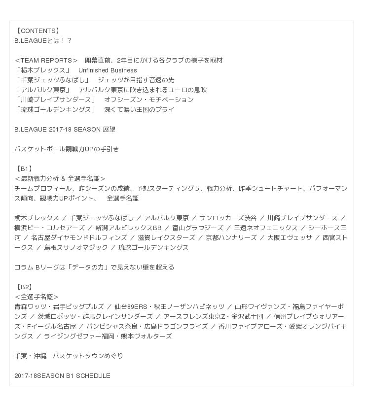 バスケットボールは、攻撃、守備、そして戦略を測る数値など、ほかの競技に比べて数多くのスタッツがありmqす。それらを理解することで、一般的な平均失点だけでは図れない能力が見えてくるのです。本書では、B1全18チームの戦力を多様なデータを用いて独自に分析しています。さらに、最新のチーム状況を把握して、2年目のB.LEAGUEをあますところなく楽しもう!そんなコンセプトの1冊です。