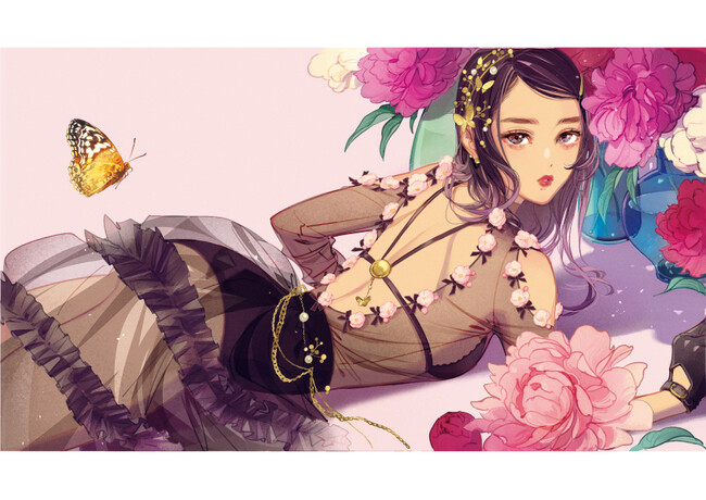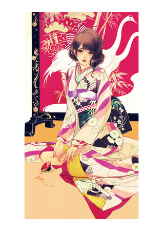 匂いたつような色香をまとった女性像はもちろんのこと、衣装・装飾品・建物・ロゴなど、画面の隅々にまで"マツオヒロミイズム"が貫かれており、独自の作品世界がみる人を魅了してやみません。