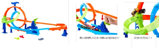 サイクロンクラッシュについている押し手を思いっきり押すことで、ダブルループの上に、ホットウィールのミニカーを勢いよく走らせて遊ぶことができます。2つの交差するダブルループを次々と走らせ、クラッシュゾーンを回避しましょう。最大4台のミニカーを同時に走らせることができ、自分で遊ぶのはもちろん友達とも一緒に競いあって遊ぶことができます。ホットウィール ミニカーが1台同梱されています。