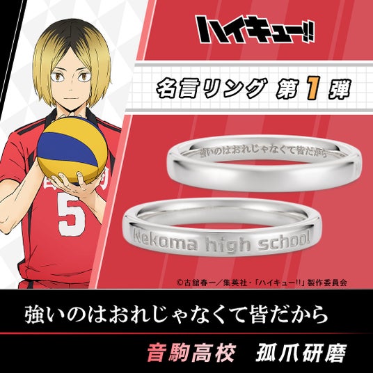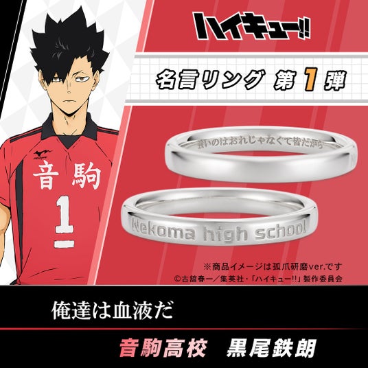 『音駒高校(Nekoma high school)』の校名をデザインしたリングの内側に、印象的なエピソードがよみがえる各キャラクターの名言を刻みました。