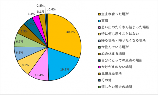 「あなたの故郷はどんな場所ですか?」の質問に対し、最も多かった答えは「生まれ育った場所」で30.3%、次いで「実家」が19.2%という結果になりました。その場所で生まれ、子どもの頃に過ごした場所を故郷だと感じている人が多いようですね。