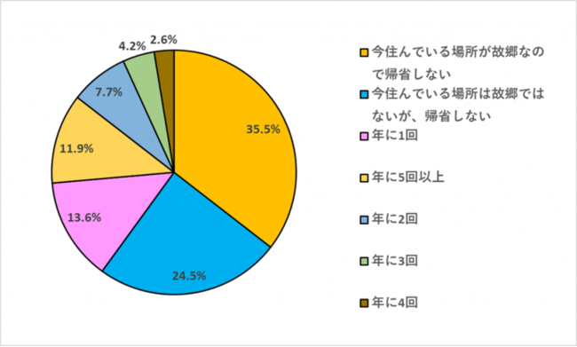 「1年に何回くらい故郷に帰りますか?」の質問に対し、最も多かった答えは「今住んでいる場所が故郷なので帰省しない」で35.5%、次いで「今住んでいる場所は故郷ではないが、帰省しない」の24.5%でした。故郷にそのまま住んでいる方が多いようですね。それ以外の方ですと、「年に1回」という回答が13.6%と最も多いことが分かりました。