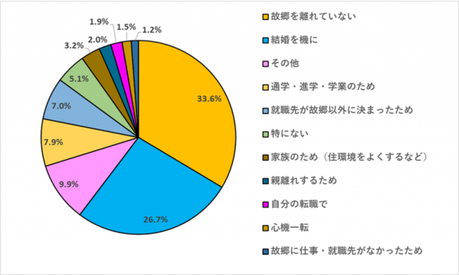 「故郷を離れた理由は何ですか?」の質問に対し、「故郷を離れていない」が最も多く、33.6%、次いで「結婚を機に」が26.7%という結果になりました。故郷を離れていない人を除くと、結婚を機に故郷を離れた方が多いようですね。