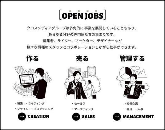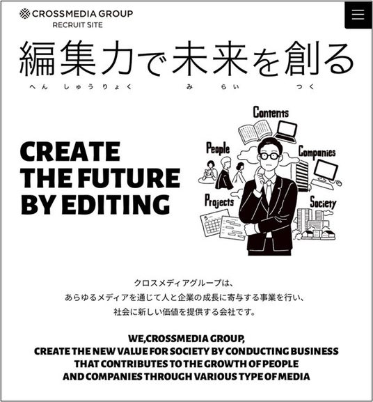 コンテンツ・メディアの編集だけでなく、人、事業・企業、そして社会を編集することで社会に新しい価値を生み出していく。私たちクロスメディアグループとともに、新しい「編集力」をビジネスに実装し、社会に貢献していきたいという考えに共感できる方とご一緒したいと考えています。クロスメディアグループには、大変だけどおもしろい、楽しい仕事がたくさんあります。仕事が楽しい人生は最高です。私たちの経営理念に共感いただき、熱心な気持ちで仕事ができる方、お待ちしています。