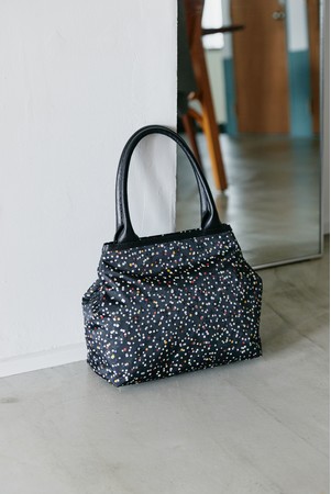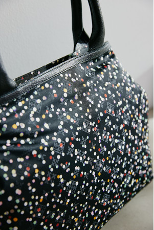 モノグラム柄のナイロンジャガードに、多色使いしたあられドットをプリントしています。