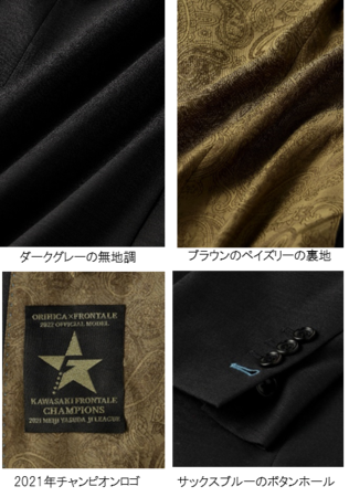 2.袖口は本切羽仕様で川崎フロンターレカラーの「サックスブルー」のボタンホールを採用。ジャケットの裏地には「内に秘めた闘志」を象徴するブラウンのペイズリー柄を採用。シックな表地とのコントラストが際立ちます。