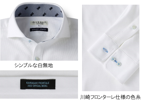 スーツ同様ネクタイのデザインも「登里享平選手」「大島僚太選手」よりご意見をいただき、ネイビーの織柄無地で作成しました。スーツに合わせ、光沢感のある上質なシルクを使用し、凹凸のある素材を採用。また、川崎フロンターレのマスコットキャラクターの「ふろん太」と「カブレラ」に加え、「ORIHICAの鍵マーク」を小剣の裏側にさりげなくあしらいました。さらに、ダークグレーのスーツに合わせて、白のシンプルなポロシャツを採用。ドライな生地感は吸汗速乾性に優れ、ストレッチ性が高いため、選手たちのしっかりと鍛えられた体にも対応可能です。また、カフス部分のボタンホールなど細部に川崎フロンターレカラーの「サックスブルー」を採用し、川崎フロンターレを堪能できる1着に仕上げました。もちろん、お仕事帰りに川崎フロンターレの試合を観戦されるサポーターの皆さまにもおススメの1着です。