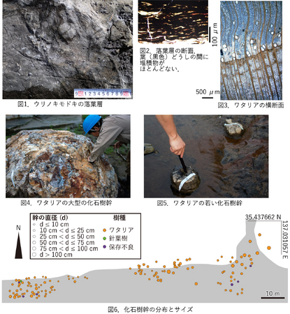 研究グループは、現在でもアクセスできる樹幹化石約130本(p1図右)の樹種を、岩石剥片を作成して調べました。また面白いことに、樹幹化石の根元にはウリノキモドキを多産する葉の化石層がありました(図1、2)。そこで、この化石層の中に含まれる葉の種類と埋まり方とを調べることにしました。