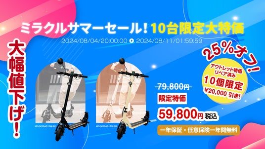 楽天「Show !t」は、明日8月4日20:00~8月11日1:59のお買い物マラソンに参加します。今回は訳あり品(開封済みアウトレット品、リペア済み)を10台限定で、20,000円引きの25%オフで販売します!さらに、任意保険一年間無料キャンペーンも継続中ですので、非常にお得に入手可能です。この機会にぜひ、特定小型電動キックボードを購入し、街を滑走してみてください!