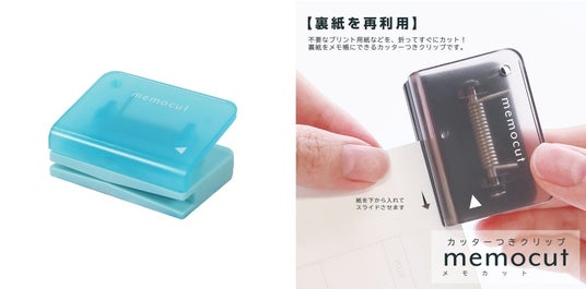 マグネットクリップにペーパーカッター機能を備えた便利なメモカットクリップ。不要なプリント用紙を折ってスライド部に通すだけで、簡単にカットできます。A6サイズにカットした紙を約40枚まで挟め、マグネット付きなので机や冷蔵庫、インテリアにも取り付け可能。
