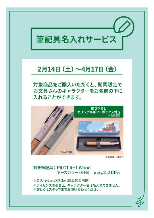 期間中、対象商品を購入いただくと、期間限定でお文具さんのキャラクターをお名前の下に入れることができます。数量限定で描き下ろしオリジナルギフトボックス付き。
