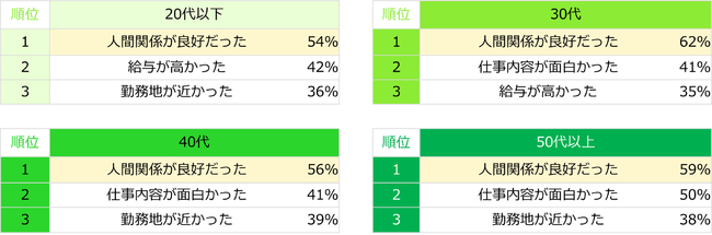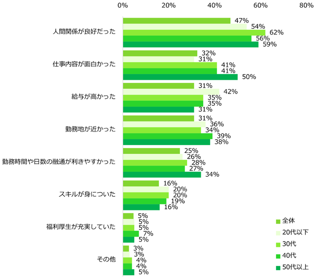 ★ 働いてよかったアルバイト先、理由のトップは「人間関係の良さ」。30代以上は「給与の高さ」より「仕事内容の面白さ」が上位に。